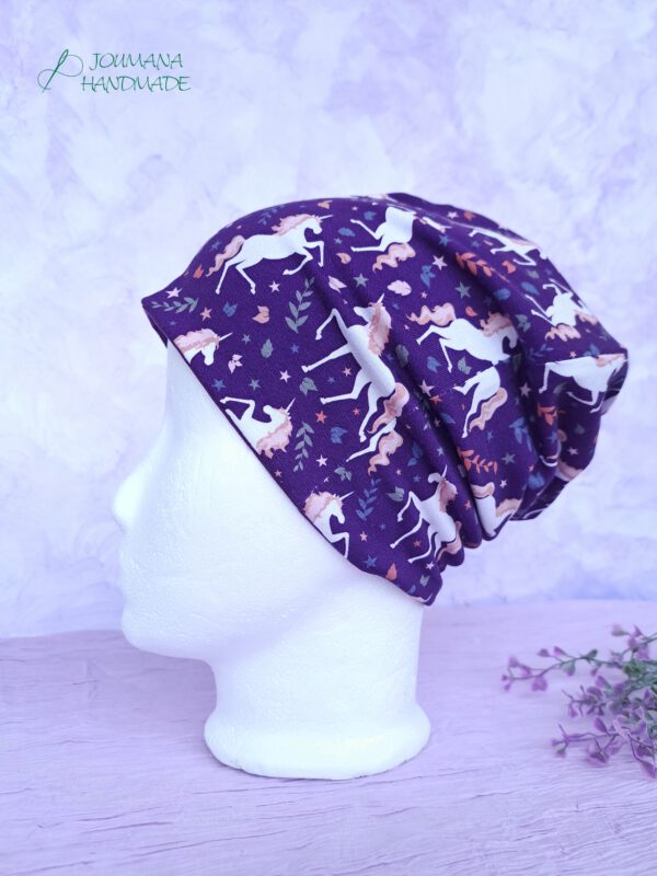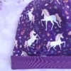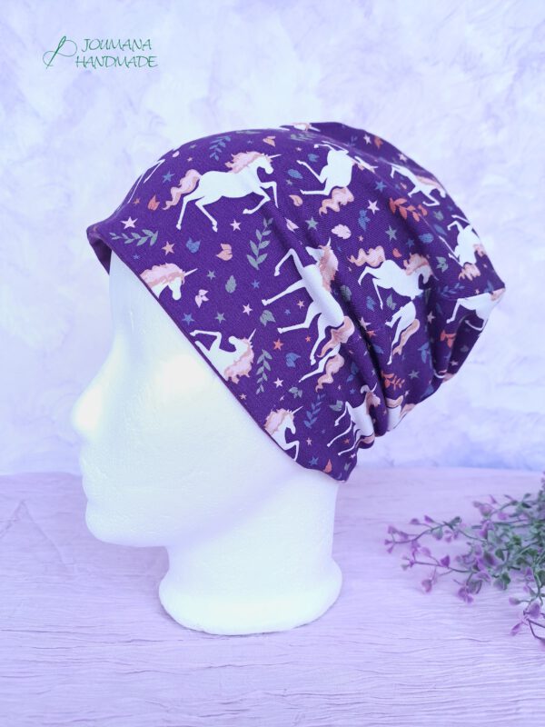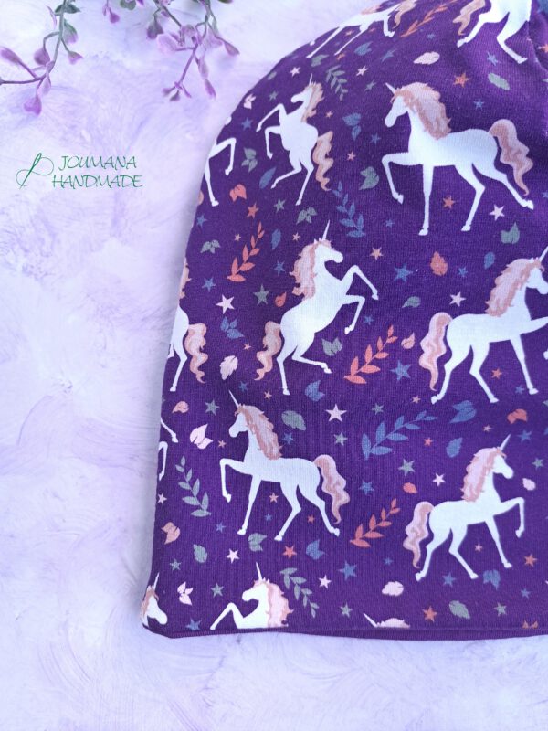 Die Einhorn Mütze aus weichem, lilafarbenen Baumwolljersey mit niedlichen Einhörner drauf und zarten, rosa Akzenten ist der perfekte Begleiter für dein Kind. Sie sitzt angenehm am Kopf, schützt zuverlässig vor Wind und ist dabei leicht und atmungsaktiv – ideal für Schule, Kindergarten oder Spielplatz. Durch den dehnbaren Stoff passt sich wunderbar an die Kopfform an und wächst etwas mit. Ein Must-have für kleine Einhorn-Liebhaber!