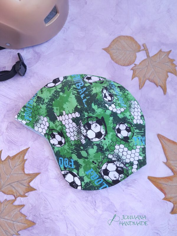 Diese besondere Helmmütze ist aus hochwertigen, doppellagigen Baumwolljersey gefertigt in einem peppigen grün mit Fußbällen und Schriftzügen drauf. Sie ist wärmend, schützt vor Wind und Kälte und ist trotzdem dünn genug, um bequem unterm Helm getragen werden zu können. Der Helm behält an Passform und Sicherheit. Die lang gezogenen Seitenpartien halten die Ohren schön warm.