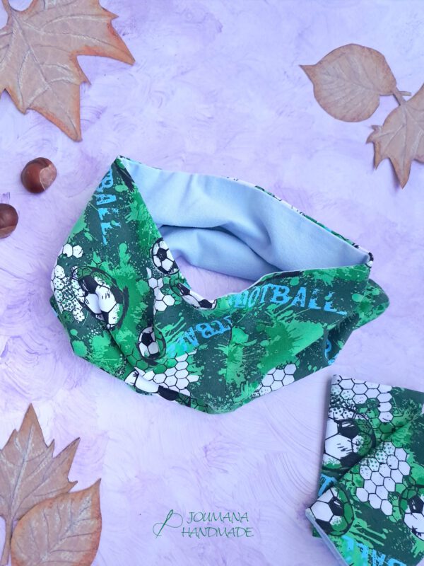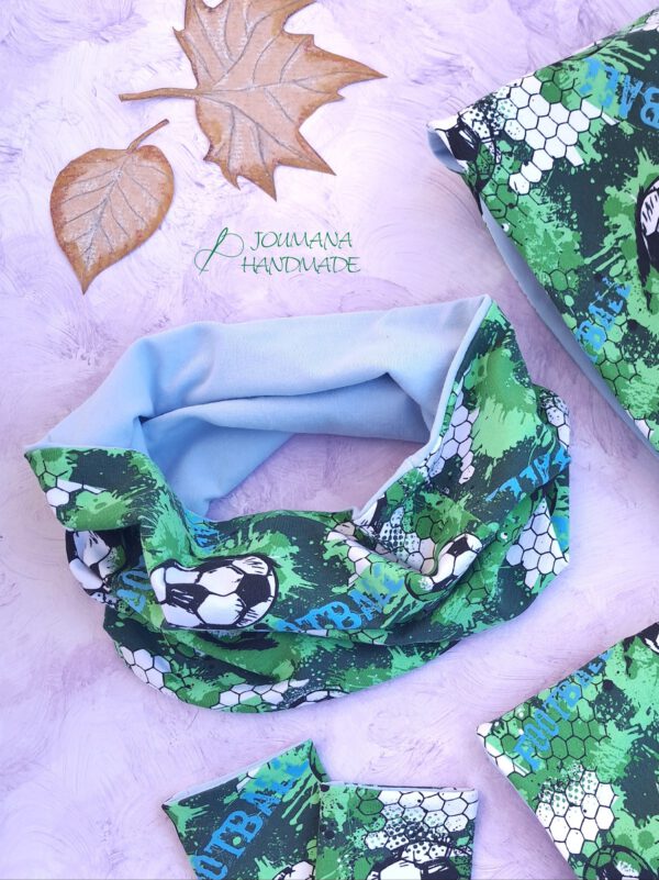 🧵 In meinem Shop findest Du für den Kinder Loop Fußball auch die passende Helmmütze, Beanie und Pulswärmer im gleichen Design.