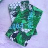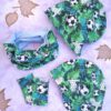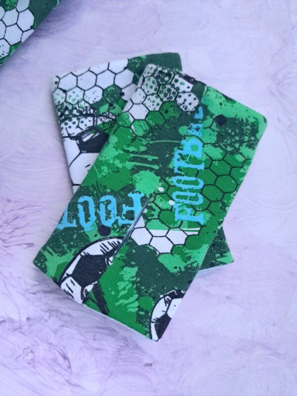 Die Pulswärmer wurden aus Baumwolljersey in einem peppigen grün mit Fußbällen und Schriftzügen drauf genäht und können gewendet werden. Die Innenseite der Pulswärmer besteht aus einem unifarbenen Baumwolljersey in hellblau.
