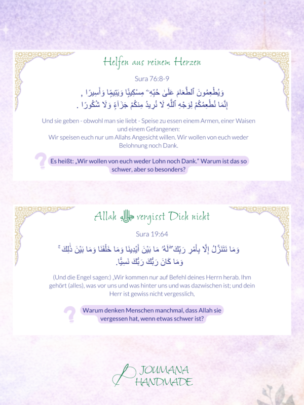 Die Fragen regen zum eigenständigen Nachdenken an und helfen, Themen wie Geduld, Selbstwert, Vertrauenswürdigkeit, Anstrengung, Vergebung und Allahs Nähe bewusst zu reflektieren.